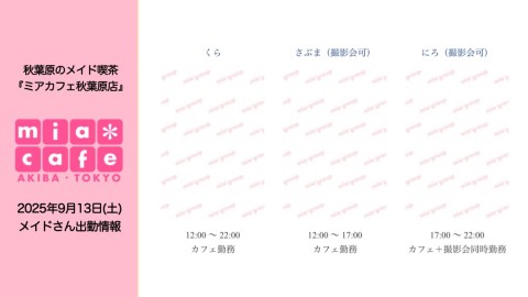 ★メイドカフェ・ミアカフェ #秋葉原 店★ ☕️営業予定日☕️ 🎀9月13日(土)  12-22 くら  12-17 さぶま  17-22 にろ 🎀9月14日(日)  12-17 みさ、新人さん【初お給仕】  17-22 さぶま、くら  リラ&フォトお呼び出し みれい 🎀9月15日(月祝)  12-17 さぶま  17-22 おとめ【卒業】、まな https://t.co/pLZUgClAe3