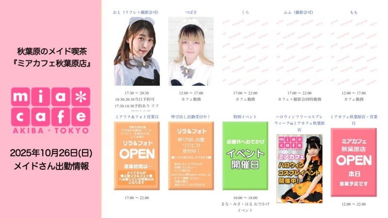 ★#メイドカフェ ・ミアカフェ #秋葉原 店★ ☕️営業予定日☕️ 👻#ハロウィン フリーコス EV👻 🎃10月25日(土)  12-17 つばさ,みさ  17-22 さぶま,にろ  リラ&フォトお呼び出し出勤 さぶま 🎃10月26日(日)  12-17 つばさ,もも  17-22 くら,ふふ  リラ&フォトお呼び出し出勤 おと #コスプレ https://t.co/Iw8jqpvp1W
