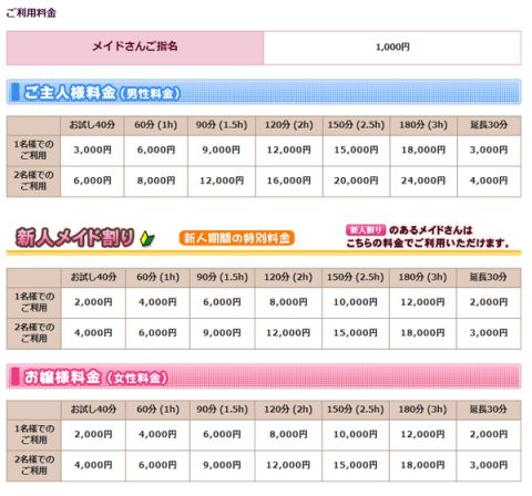 | 内容 | ●オプション 写真撮影 メイドさんの萌えポーズを撮影(5枚まで) 1,000円 写真撮影∞ 枚数無制限で写真撮影 2,000円 ツーショットチェキ メイドさんのメッセージ付チェキ!(2枚) 1,000円 雨もへっちゃら相愛傘 雨の日限定!メイドさんとアイアイ傘 ※オプション用のカサを貸し出しいたします 1,000円 ゆびずもう メイドさんと、のこったのこった指相撲3回勝負 1,000円 萌えレコ お客様の携帯へメイドさんが萌えボイスを録音♪ (3フレーズまでOK) ※録音機能のある携帯電話をお持ちの方に限ります ※転用防止のためご主人さまのお名前を入れさせて頂きます。 1,000円 |