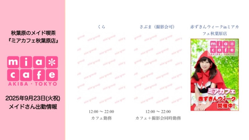 å¶æ¥æé | âãã¢ã«ãã§æ±äº¬åºïŒã¡ã€ãã«ãã§ïŒhttp://www.mia-cafe.com/ãâ â¡å¹³æ¥ãæïœéãïŒïŒïŒïŒïŒïœïŒïŒïŒïŒïŒ â¡åæã»æ¥æã»ç¥æ¥ãïŒïŒïŒïŒïŒïœïŒïŒïŒïŒïŒ â å®äŒæ¥ããªãïŒ2019幎1æããå®äŒæ¥å»æ¢ïŒ â¡ã©ã¹ããªãŒããŒãéåºã®ïŒïŒåå ãïŒïŒïŒïŒïŒéåºã®å ŽåâïŒïŒïŒïŒïŒã©ã¹ããªãŒããŒ å¶æ¥æ¥ãåºå€ç¶æ³ã«ã€ããŠã¯ãã¡ãã http://pandaland.cutegirl.jp/mif/c_cms_csv/sch_top.php âãã¢ãªã©ïŒãã©ãæ±äº¬åºïŒæ®åœ±äŒïŒãªãã¬ïŒhttp://www.mif-lr.com/ãâ â¡å šæ¥ãïŒïŒïŒïŒïŒãïŒïŒïŒïŒïŒãã§ãããªã©ã¯ãŒãŒã·ã§ã³åºå€ã¹ã¿ãããããæé垯ã®ã¿å¶æ¥ã§ãã â å®äŒæ¥ã¯äžå®äŒïŒåºå€ã¹ã¿ãããããæé垯ã®å¶æ¥ïŒ â¡æçµåä»ãéåºã®ïŒïŒåå ãïŒïŒïŒïŒïŒéåºã®å ŽåâïŒïŒïŒïŒïŒïŒïŒïŒïŒïŒïŒè¿ã«æœè¡æéãçµããã³ãŒã¹ïŒ â»é«æ ¡çäžå¯ âæ·±å€å¶æ¥ã«ã€ããŠã¯ãå ¬åŒãµã€ãå³äžã® http://market.chu.jp/schedule1/sche37.cgi ãã¢ã°ã«ãŒãç·åã¹ã±ãžã¥ãŒã«ïŒïŒ°ïŒ£ã»ã¹ããïŒ http://market.chu.jp/schedule1/sche37.cgi?dm=1 ãã¢ã°ã«ãŒãç·åã¹ã±ãžã¥ãŒã«ïŒã¬ã©æºåž¯ïŒ ãã芧ãã ãããåç¥æ¥ã®ã¿å¶æ¥ãšãªããŸããåç¥æ¥ä»¥å€ã¯æ·±å€å¶æ¥ããããŠãããŸããã æ·±å€å¶æ¥å¯Ÿè±¡æ¥ãïŒïŒïŒïŒïŒãç¿æïŒïŒïŒïŒïŒïŒ¬ïŒïŒ¯ïŒïŒïŒïŒïŒïŒ | ||||||||||||||
