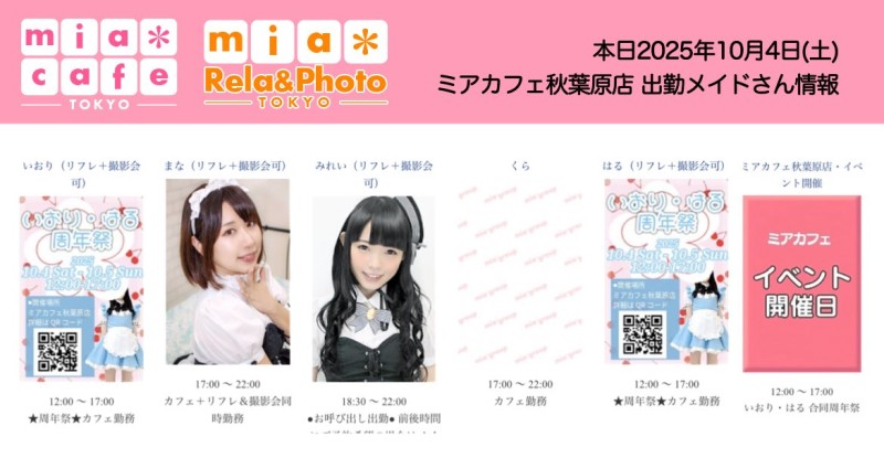 å¶æ¥æé | âãã¢ã«ãã§æ±äº¬åºïŒã¡ã€ãã«ãã§ïŒhttp://www.mia-cafe.com/ãâ â¡å¹³æ¥ãæïœéãïŒïŒïŒïŒïŒïœïŒïŒïŒïŒïŒ â¡åæã»æ¥æã»ç¥æ¥ãïŒïŒïŒïŒïŒïœïŒïŒïŒïŒïŒ â å®äŒæ¥ããªãïŒ2019幎1æããå®äŒæ¥å»æ¢ïŒ â¡ã©ã¹ããªãŒããŒãéåºã®ïŒïŒåå ãïŒïŒïŒïŒïŒéåºã®å ŽåâïŒïŒïŒïŒïŒã©ã¹ããªãŒããŒ å¶æ¥æ¥ãåºå€ç¶æ³ã«ã€ããŠã¯ãã¡ãã http://pandaland.cutegirl.jp/mif/c_cms_csv/sch_top.php âãã¢ãªã©ïŒãã©ãæ±äº¬åºïŒæ®åœ±äŒïŒãªãã¬ïŒhttp://www.mif-lr.com/ãâ â¡å šæ¥ãïŒïŒïŒïŒïŒãïŒïŒïŒïŒïŒãã§ãããªã©ã¯ãŒãŒã·ã§ã³åºå€ã¹ã¿ãããããæé垯ã®ã¿å¶æ¥ã§ãã â å®äŒæ¥ã¯äžå®äŒïŒåºå€ã¹ã¿ãããããæé垯ã®å¶æ¥ïŒ â¡æçµåä»ãéåºã®ïŒïŒåå ãïŒïŒïŒïŒïŒéåºã®å ŽåâïŒïŒïŒïŒïŒïŒïŒïŒïŒïŒïŒè¿ã«æœè¡æéãçµããã³ãŒã¹ïŒ â»é«æ ¡çäžå¯ âæ·±å€å¶æ¥ã«ã€ããŠã¯ãå ¬åŒãµã€ãå³äžã® http://market.chu.jp/schedule1/sche37.cgi ãã¢ã°ã«ãŒãç·åã¹ã±ãžã¥ãŒã«ïŒïŒ°ïŒ£ã»ã¹ããïŒ http://market.chu.jp/schedule1/sche37.cgi?dm=1 ãã¢ã°ã«ãŒãç·åã¹ã±ãžã¥ãŒã«ïŒã¬ã©æºåž¯ïŒ ãã芧ãã ãããåç¥æ¥ã®ã¿å¶æ¥ãšãªããŸããåç¥æ¥ä»¥å€ã¯æ·±å€å¶æ¥ããããŠãããŸããã æ·±å€å¶æ¥å¯Ÿè±¡æ¥ãïŒïŒïŒïŒïŒãç¿æïŒïŒïŒïŒïŒïŒ¬ïŒïŒ¯ïŒïŒïŒïŒïŒïŒ | ||||||||||||||