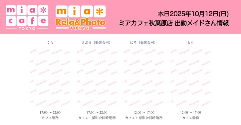 å¶æ¥æé | âãã¢ã«ãã§æ±äº¬åºïŒã¡ã€ãã«ãã§ïŒhttp://www.mia-cafe.com/ãâ â¡å¹³æ¥ãæïœéãïŒïŒïŒïŒïŒïœïŒïŒïŒïŒïŒ â¡åæã»æ¥æã»ç¥æ¥ãïŒïŒïŒïŒïŒïœïŒïŒïŒïŒïŒ â å®äŒæ¥ããªãïŒ2019幎1æããå®äŒæ¥å»æ¢ïŒ â¡ã©ã¹ããªãŒããŒãéåºã®ïŒïŒåå ãïŒïŒïŒïŒïŒéåºã®å ŽåâïŒïŒïŒïŒïŒã©ã¹ããªãŒããŒ å¶æ¥æ¥ãåºå€ç¶æ³ã«ã€ããŠã¯ãã¡ãã http://pandaland.cutegirl.jp/mif/c_cms_csv/sch_top.php âãã¢ãªã©ïŒãã©ãæ±äº¬åºïŒæ®åœ±äŒïŒãªãã¬ïŒhttp://www.mif-lr.com/ãâ â¡å šæ¥ãïŒïŒïŒïŒïŒãïŒïŒïŒïŒïŒãã§ãããªã©ã¯ãŒãŒã·ã§ã³åºå€ã¹ã¿ãããããæé垯ã®ã¿å¶æ¥ã§ãã â å®äŒæ¥ã¯äžå®äŒïŒåºå€ã¹ã¿ãããããæé垯ã®å¶æ¥ïŒ â¡æçµåä»ãéåºã®ïŒïŒåå ãïŒïŒïŒïŒïŒéåºã®å ŽåâïŒïŒïŒïŒïŒïŒïŒïŒïŒïŒïŒè¿ã«æœè¡æéãçµããã³ãŒã¹ïŒ â»é«æ ¡çäžå¯ âæ·±å€å¶æ¥ã«ã€ããŠã¯ãå ¬åŒãµã€ãå³äžã® http://market.chu.jp/schedule1/sche37.cgi ãã¢ã°ã«ãŒãç·åã¹ã±ãžã¥ãŒã«ïŒïŒ°ïŒ£ã»ã¹ããïŒ http://market.chu.jp/schedule1/sche37.cgi?dm=1 ãã¢ã°ã«ãŒãç·åã¹ã±ãžã¥ãŒã«ïŒã¬ã©æºåž¯ïŒ ãã芧ãã ãããåç¥æ¥ã®ã¿å¶æ¥ãšãªããŸããåç¥æ¥ä»¥å€ã¯æ·±å€å¶æ¥ããããŠãããŸããã æ·±å€å¶æ¥å¯Ÿè±¡æ¥ãïŒïŒïŒïŒïŒãç¿æïŒïŒïŒïŒïŒïŒ¬ïŒïŒ¯ïŒïŒïŒïŒïŒïŒ | ||||||||||||||
